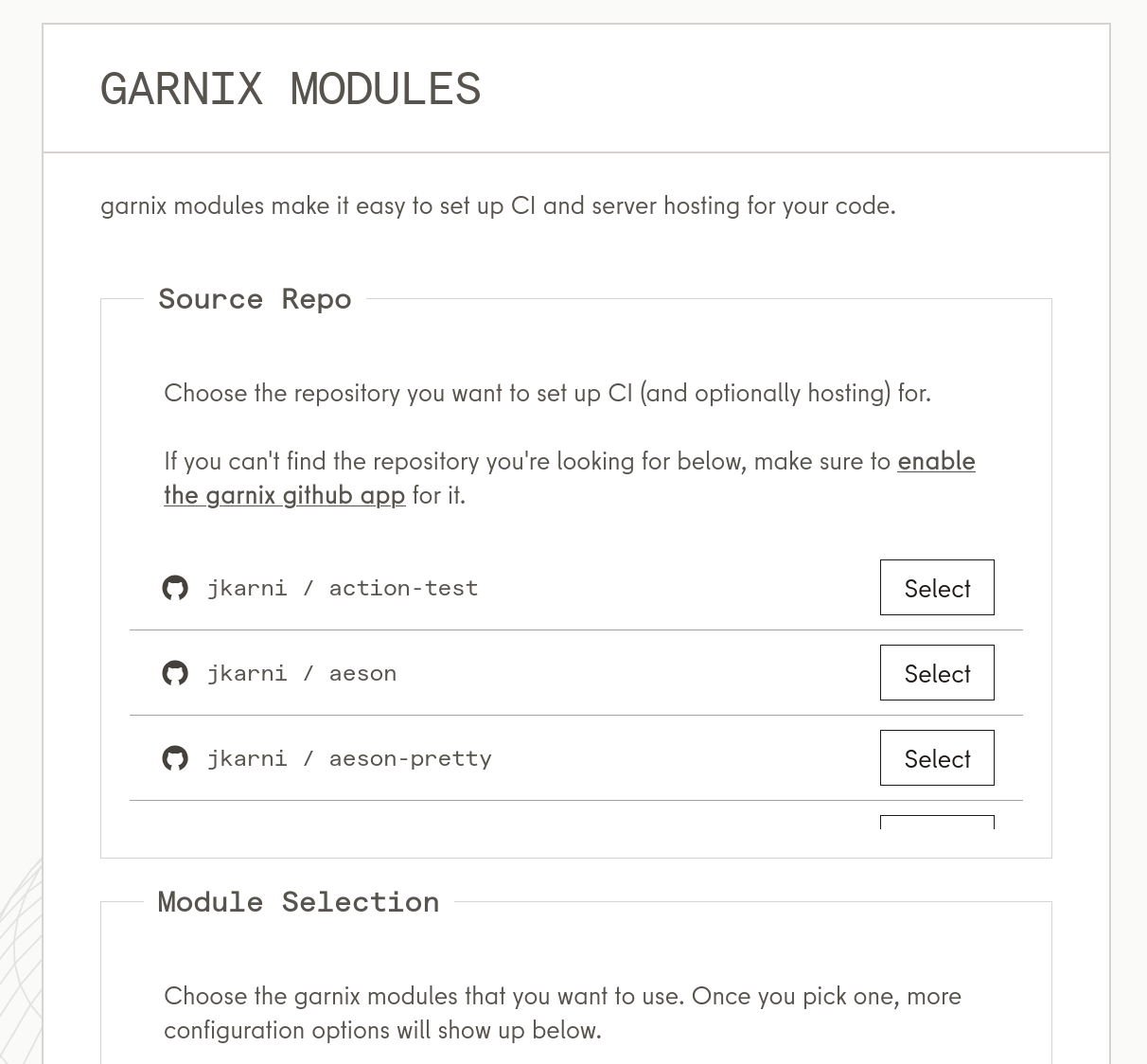 garnix modules allows setting up garnix CI and hosting quickly through the modules tab. After specifying basic facts about your project, such as what your repository is, what stack it uses and whether there is a web server you want to deploy, garnix allows you to test run a build and deployment.